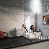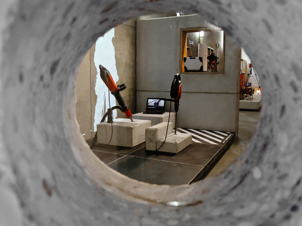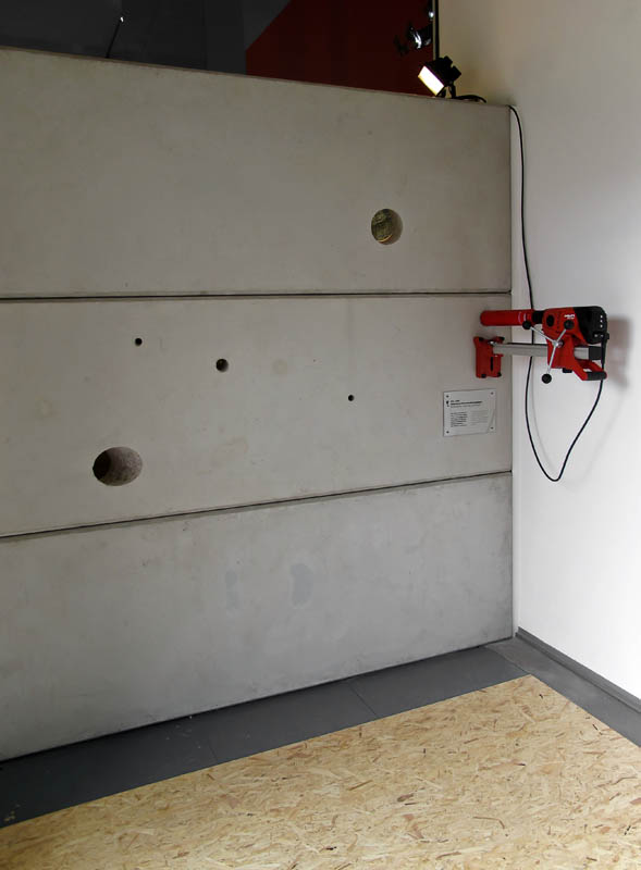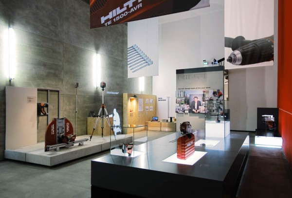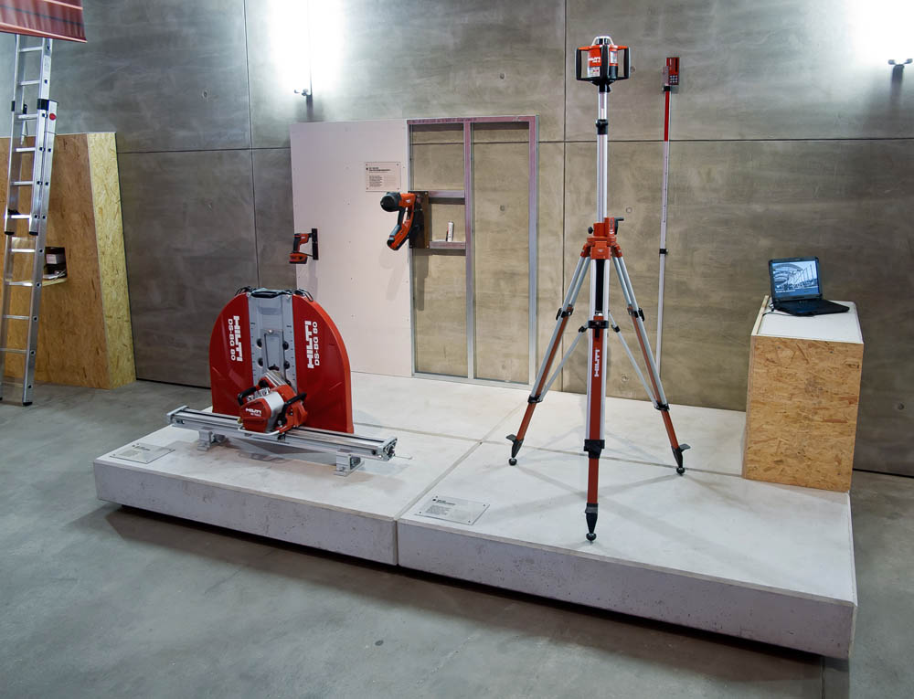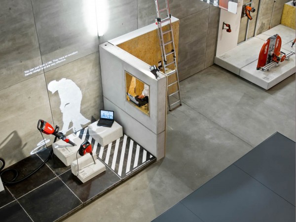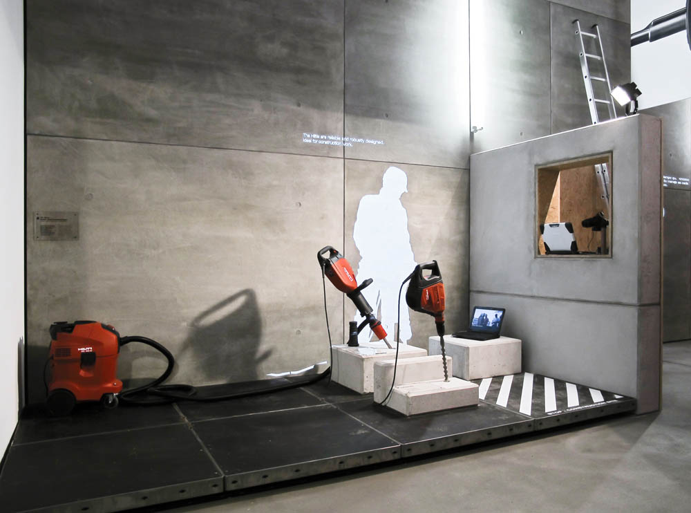 Exhibition platforms out of raw concrete, particle board, and planks suggest work in progress. This is underlined by projected customer silouhettes and statements. Brand new tools (yet to be proven on site) can be touched and examined. The broad range of tools display the design consistence among the product lines.