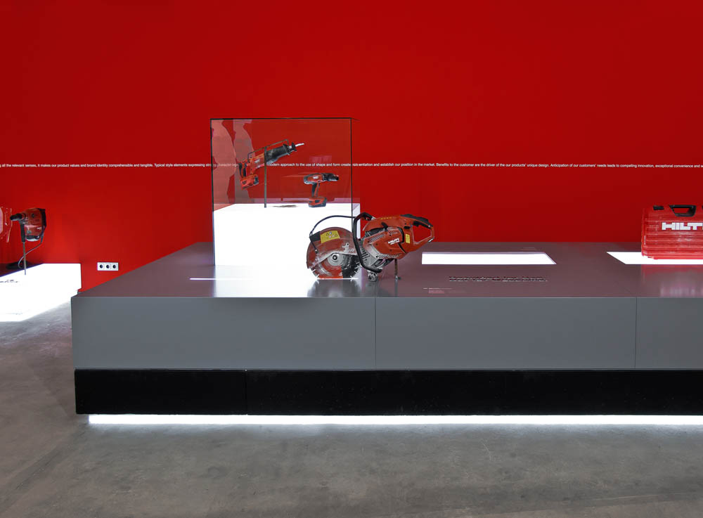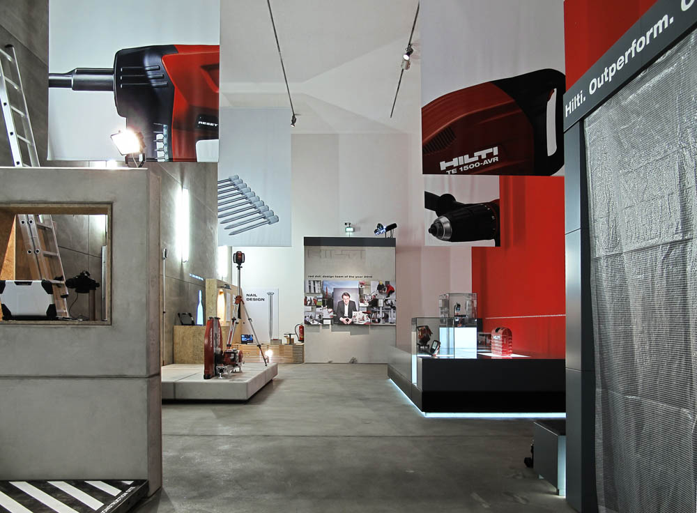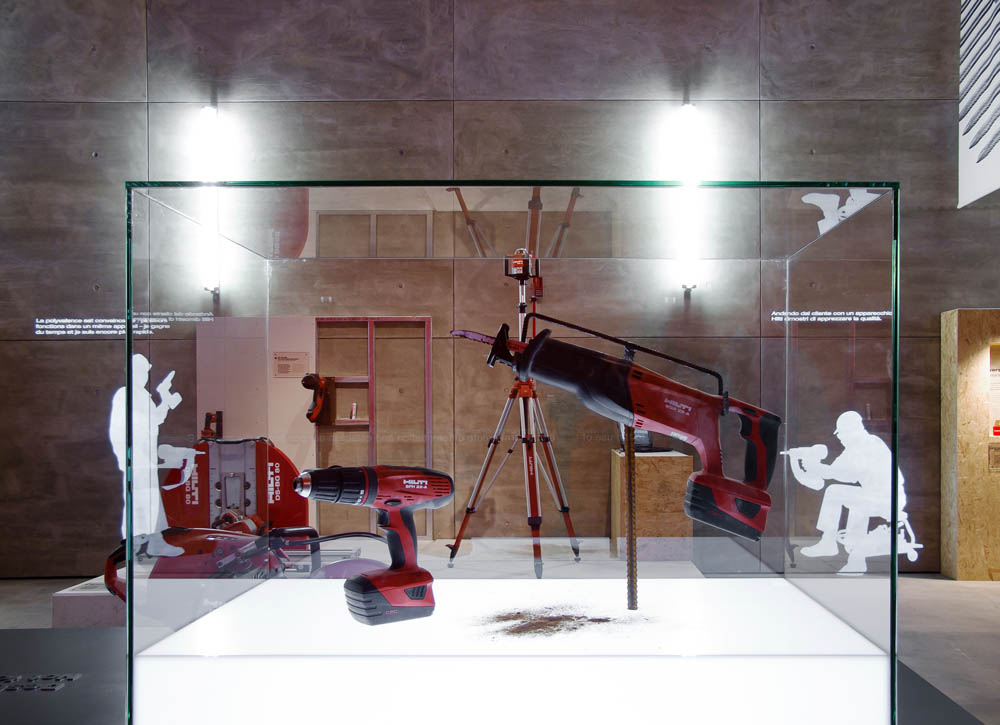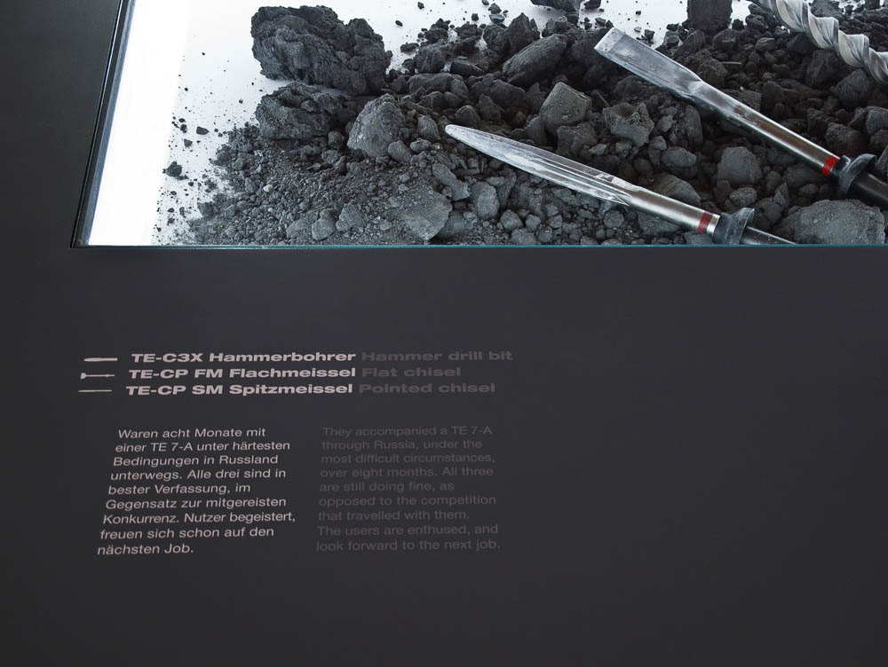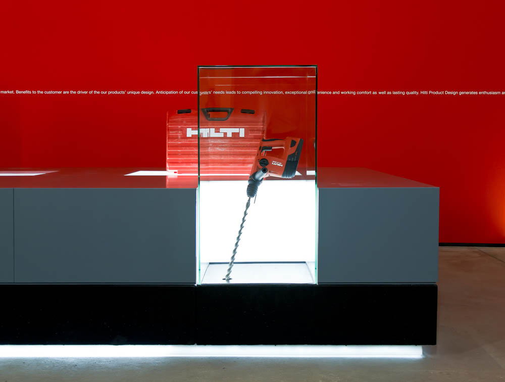 Heavily used tools in high-end illuminated showcases represent the core aim of Hilti design: product use. Short texts explain the individual tools histories: Who used it, how long, for what kind of work, e.g. Demolished 207 bridge pillars of different size during its working life“ and still works perfectly. The used products beatifully proof the Hilti brand claim Outperform. Outlast.