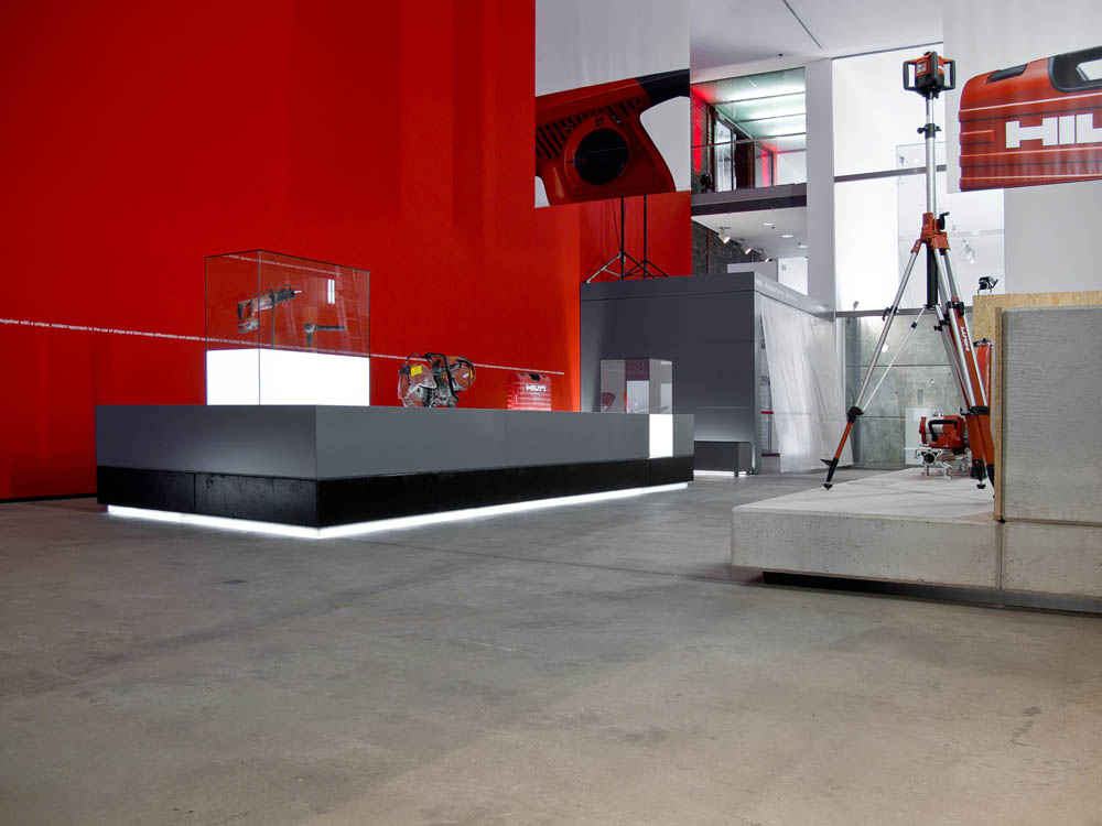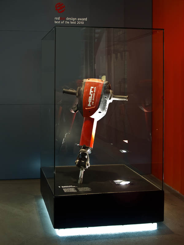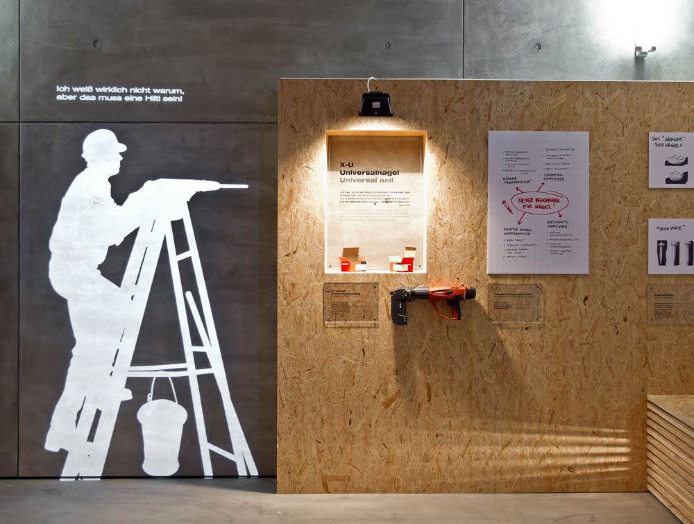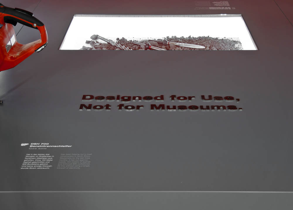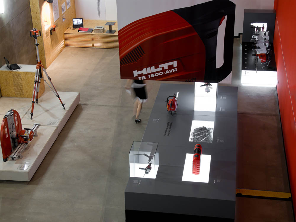 Heavily used tools in high-end illuminated showcases represent the core aim of Hilti design: product use. Short texts explain the individual tools histories: Who used it, how long, for what kind of work, e.g. Demolished 207 bridge pillars of different size during its working life“ and still works perfectly. The used products beatifully proof the Hilti brand claim Outperform. Outlast.