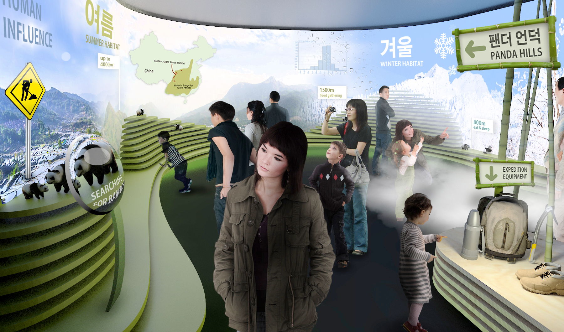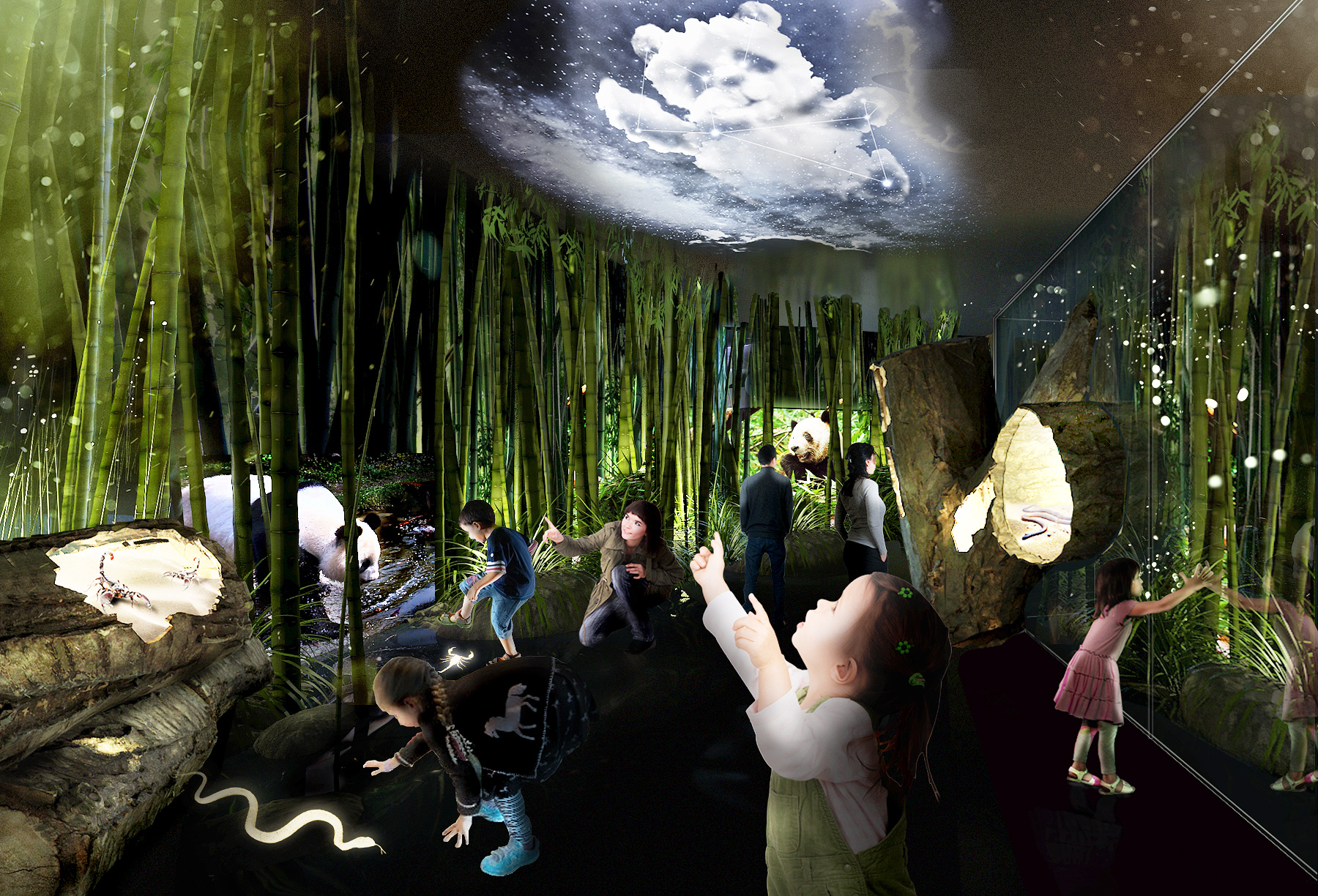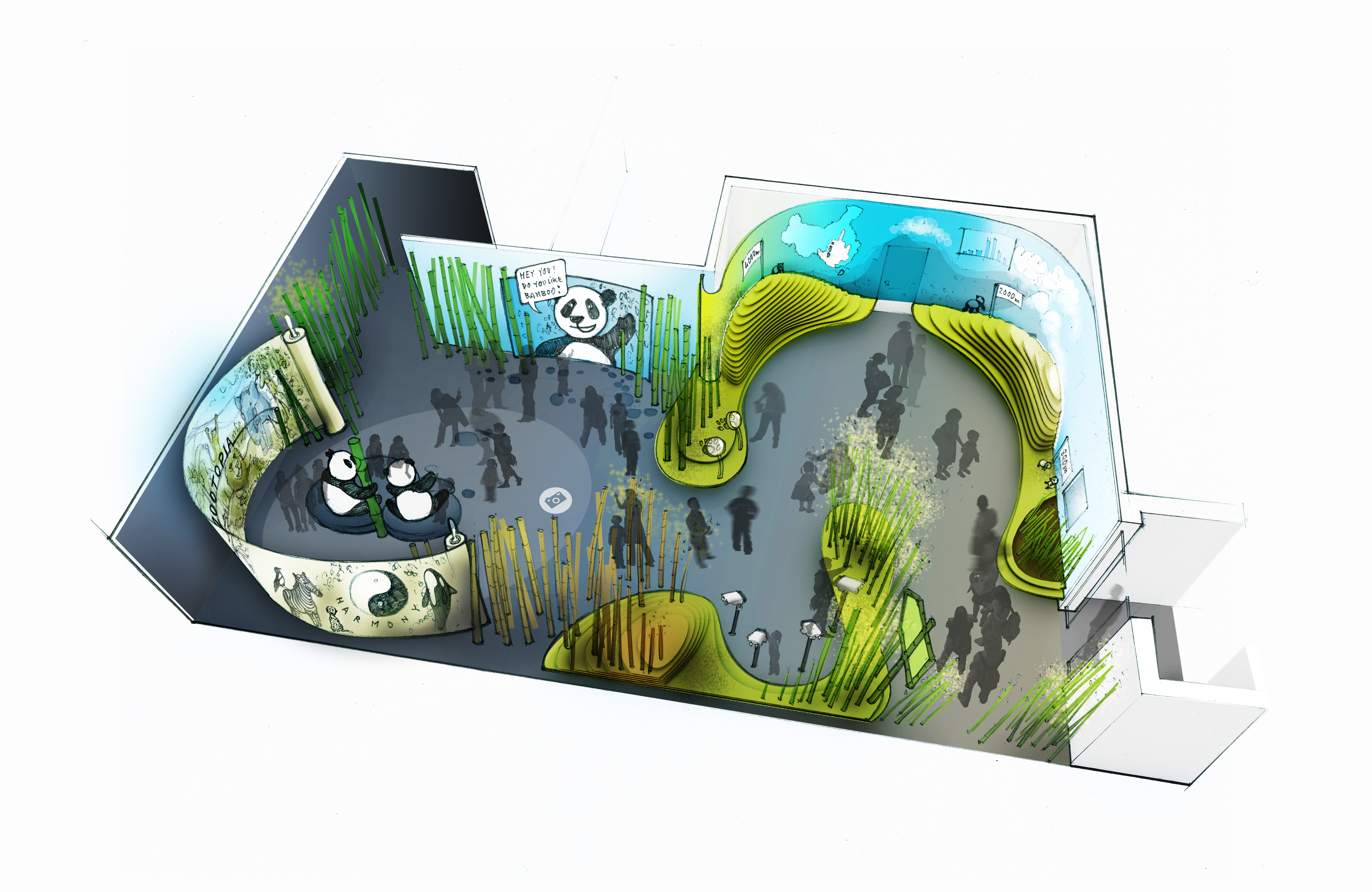3d visuals, scenography PANDA WORLD [dan pearlman] 16. August 2016 admin queuing exhibition concept & design development habitat expedition the panda dream scenario twilight zone with additional animals & showcases alternate exhibition layout aerial rendering of the entire Panda enclosure on site realisation