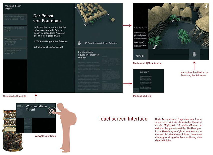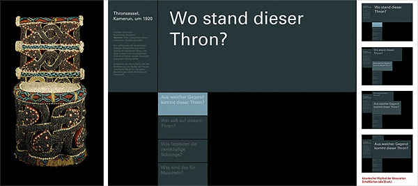 In cooperation with the Rautenstrauch-Joest-Museum of Ethnography (Köln, Germany), i developed a modular touchscreen interface for multifaceted use in exhibition contexts.